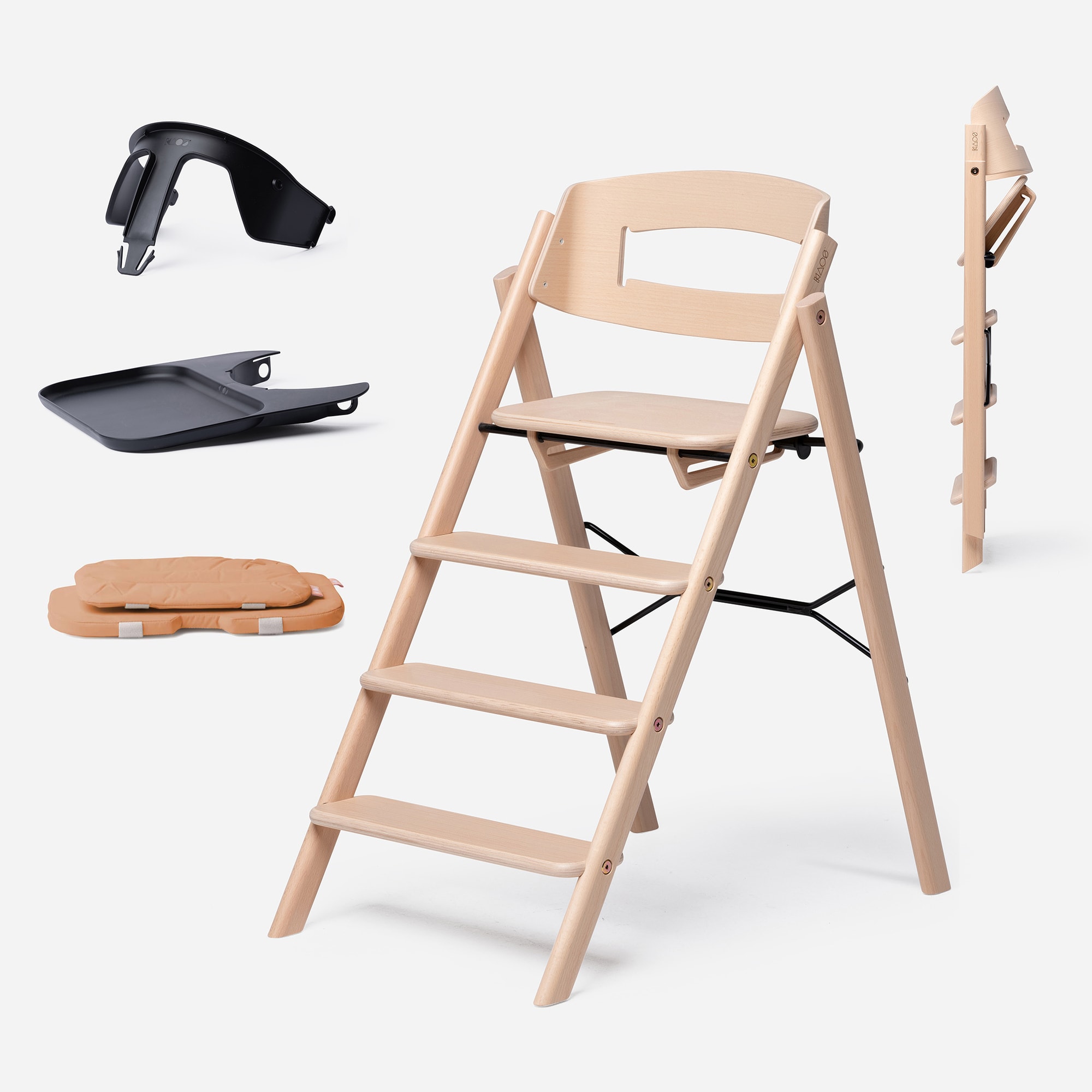 The KAOS Klapp foldable high chair invites the child to climb up and down the KAOS Klapp high chair on their own. The child gets ergonomic and active seating, resting the legs naturally at the different steps as they grow. KAOS Klapp high chair for children comes ready assembled in the box. Just unfold the chair, click the seat into locking position and it's ready to use. It's easy to keep clean due to its smooth and solid finish.